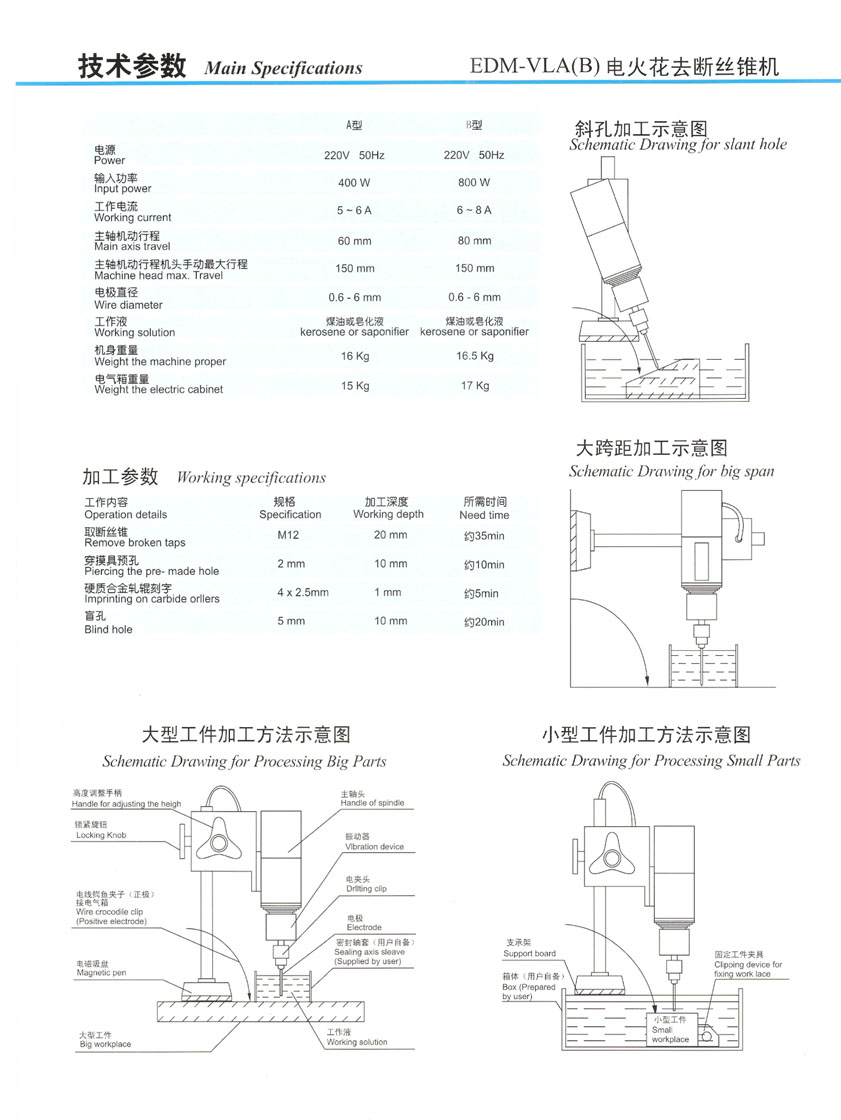苏州中航长风取断丝锥机EDM-VLA 手提式小孔机适用于生产过程中折断丝锥、钻头的去除,机头任意旋转,可加工直径孔、斜孔、大跨距孔等,特别方便于大工件折断丝锥、钻头的去除。该设备体积小,使用方便,操作简单,稳定可靠,适用范围广,可在合金钢、淬火钢、硬质合金等难以加工的材料上穿孔、扩孔;可配用不同形状的电极加工异性孔、槽以及在轧辊上刻字、打标记等。