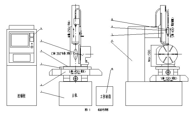 四轴数控电火花穿孔机本机床主要由床身1、X、Y轴拖板2、接液盘3、花岗石工作台4、数控分度头5、立柱6、主轴头7、Z轴滑块8、旋转头9、高、低压工作液系统10及数控电源箱11等部分组成。