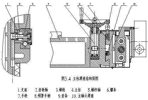 图3.4为电火花数控穿孔机立柱滑座结构简图。立柱4通过安装螺釘固定在床身上,齿条9固定在主轴头滑座10上,转动手轮7,通过一对蜗轮蜗杆齿轮齿条传动带动主轴头滑座上、下运动,以调节导向器与加工工件之间的距离。注意:顺时针转动手轮,主轴头向上运动;逆时针转动手轮,主轴头向下运动!滑座通过锁紧手柄8锁紧。