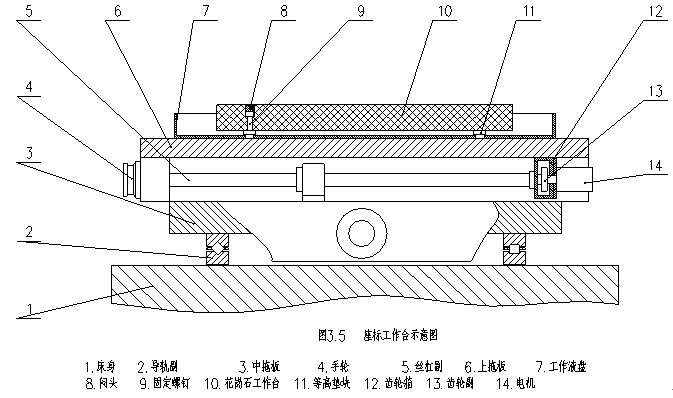 座标工作台横向运动行程(X轴)为400mm,纵向运动行程(Y轴)为320mm。座标工作台主要由3中拖板、上拖板6、工作液盘7、花岗石台面10等组成,见图3.5。电机14经过一对齿轮13、滚珠丝杠副5减速后将电机的旋转运动转换成拖板的直线运动。拖板导轨2为镶钢V—平滚动导轨,上下均用钢板罩壳盖住。