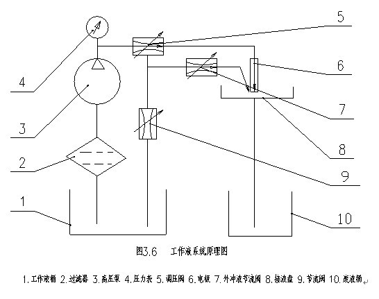 图3.6为高压工作液系统原理图。干净的工作液桶1中的工作液经过滤器2过滤后由高压泵3加压送到电极6。高压泵上的调压阀5用于控制送到电极的工作液压力,压力表4显示调节的压力。工作液经电极后,从工作台上的接液盘6回到废水箱10中。
