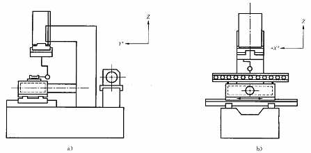 检验步骤:在工作台上调整平尺,使其与X轴运动平行,并将角尺紧靠在平尺上。指示器固定在头架上并使之触及角尺。在整个测量长度上移动Y轴并记下指示器读数。也可以只使用角尺,此时: