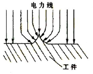 加工时,在工件阳极附近形成一层很薄的氧化膜,可在工件阳极与电解液之间起到隔离作用。该氧化膜具有较高的电阻和较小的电导率,可阻止工件阳极表面进一步溶解,对工件阳极具有一定保护作用。在电解液的快速冲刷作用下,工件阳极表面凹陷处的氧化膜因不易扩散而较厚;工件阳极表面凸出处(如毛刺、微观凸出部位等)的氧化膜因容易扩散而较薄。由于氧化膜的分布不均匀,使毛刺等凸出部位始终与新鲜的电解液接触,因此毛刺部位的金属溶解速度远大于阳极表面的其它部位,从而使毛刺被迅速溶解、去除。 在阳极溶解过程中,根据电化学加工基本规律(法拉第电解定律)可推导出金属阳极(工件)沿进给方向的深度蚀除速度va(mm/min)为 va=hwi式中:h——电流效率 w——被电解物质的体积电化学当量(mm3/A·h) i——电流密度(A/cm2) 当电解液的成分、浓度、加工温度等参数确定后,阳极某点的蚀除速度主要取决于通过该点的电流密度i。 根据电场理论可知,在零件表面毛刺等凸出部位电荷较集中,在表面凹陷处电荷则较少。由于电力线分布不均匀,凸出部位的电力线分布密集,电流密度高,金属去除较多(见图2);凹陷部位的电力线分布相对稀疏,电流密度较低,金属去除较少。由于毛刺处通过的电流密度远大于工件阳极表面的其它部位,因此毛刺被迅速溶解。 综上所述,由于氧化膜分布不均匀,工件阳极表面毛刺等凸出部位氧化膜较薄,可始终与新鲜电解液保持接触,因此电化学反应速度快;由于电力线分布不均匀,工件阳极表面毛刺等凸出部位电力线分布密集,电流密度大,蚀除速度较快。因此,脉冲电化学去毛刺加工可达到迅速去除、溶解毛刺并形成光滑圆角的目的。通过合理采用工具阴极遮蔽技术,可有选择地去除毛刺,不会影响工件阳极表面原有的尺寸精度和表面质量。