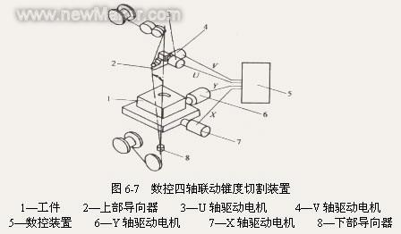 线切割锥度切割装置用于某些有锥度(斜度)的内外表面,在线切割机床上广泛采用,实现的方法也有多种,比较常见的一种结构型式是数控四轴联动锥度切割装置,如图 6-7 所示。它主要依靠上部导向器作 U 、 V 轴驱动,与坐标工作台的 X 、 Y 轴驱动构成数控四轴联动,使电极丝倾斜一定的角度,从而切割工件上各个方向的斜面和加工上下截面形状异形的扭转体,最大切割锥度一般为 ± 15 °~± 30 °。