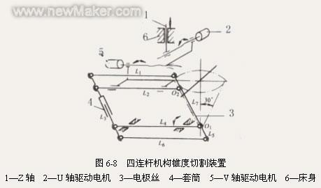 图 6-8 所示为四连杆机构锥度切割装置,由 U 、 V 轴电机驱动“ L 2 -L 3 -L 4 - 电极丝”所组成的四连杆机构实现锥度切割。工作液的上、下喷嘴分别设置在连杆 L 7 和 L 5 上,构成了 L 1 -L 3 -L 2 - L 7 和 L 4 -L 3 -L 6 - L 5 两个联动的四连杆机构实现同轴冲液。如果将丝架上、下臂的两个导向器设在四连杆机构的球心 O 1 和 O 2 上,则在进行锥度切割时无加工原理误差。