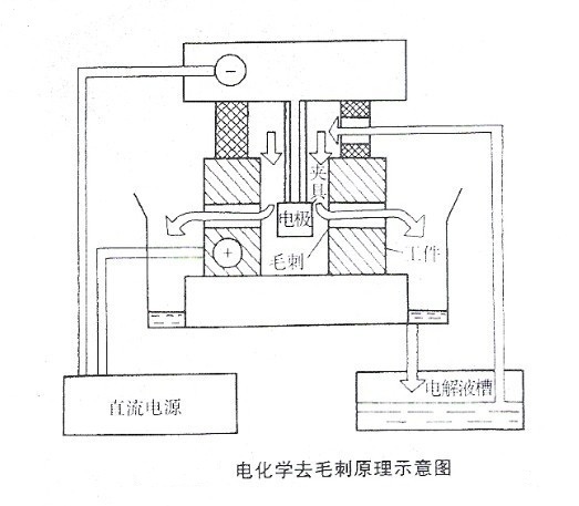 内孔去毛刺|相交孔电解去毛刺机是运用电化学去毛刺技术开发的产品,电化学去毛刺是利用电能、化学能溶解阳极去掉毛刺。(简单原理见下图)。机械零件与直流电源的正极相连为阳极,成形工具与直流电源的负极相连为阴极,两极之间保持一定的间隙,让电解液循环流动。当阳极和阴极浸入溶液并通入直流电后,阳极表面发生电化学反应,机械零件表面被溶解的金属与电解液形成黏性液体集中在机械零件表面的低凹处,具有较高的电阻和较小的腐蚀;而毛刺突出于机械零件表面,在温差的影响下,液膜难以形成,通电后电力线高度集中于毛刺部分距阴极最近的毛刺将以最快速度溶解,直到毛刺全部溶解,边缘逐渐形成圆角,即达到去毛刺的目的。