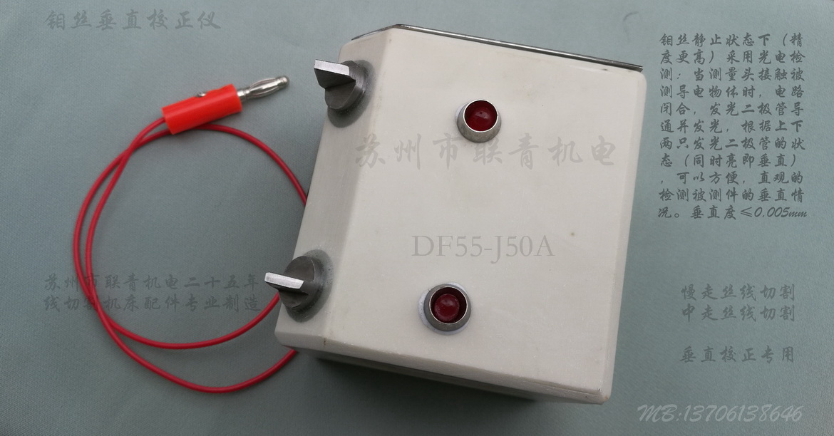 线切割钼丝校正器 垂直校正仪 慢走丝垂直校正 中走丝垂直校正 光电垂直校正仪 DF55-J50垂直校正器 该钼丝垂直校正仪在钼丝静止状态下(精度更高)采用光电检测:当测量头接触被测导电物体时,电路闭合,发光二极管导通并发光,根据上下两只发光二极管的状态(同时亮即垂直),可以方便,直观的检测被测件的垂直情况。垂直度≤0.005mm